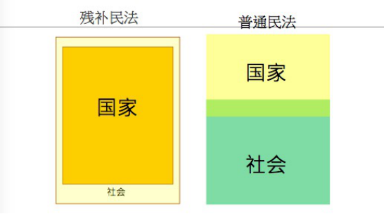 用图解来看,普通的民法是在国家和社会虽有交叉但大致平衡的环境中。但是《民法通则》面对的还是一个国家压倒性的社会,所以他只需要一个条文就可以去处理不当得利、无应管理。他只要很少条文去处理合同,也没有那么多的问题。但这个时代已经过去了。