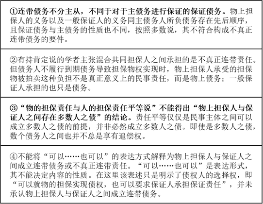 肯定说将担保人之间的关系定位于多数人之债的关系乃至连带债务的观点不能成立。债权人作为担保权人享有的担保物权的次序权等权利以及物上保证人所负的义务全部归属于担保物权关系而非债的关系。构成债的关系,必须存在着主给付义务和与之相对应的债权。然而,物上担保人所负义务均非主给付义务,债权人对物上担保人享有的权利亦无与之相对应的主给付义务。因此,债权人与物上保证人不是债的关系,更非多数人之债;两者负有的义务就不具有内在联系,因而就缺乏确立物上担保人之间、物上担保人与保证人之间相互享有追偿权的前提和基础。