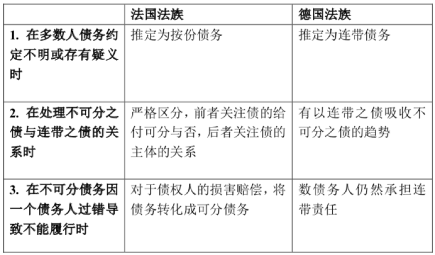 再者,从法族归属的角度来看,我国在多数人之债的领域应选择(或更准确点说是已选择)拉丁法族的模式,而不是德国法族的模式,这就决定了我们应该严格区分连带之债与不可分之债,坚持意思自治的原则,坚持有利于债务人原则。大陆法系可分为两个法族,一个是以法国为代表的拉丁法族,一个是以德国为代表的德国法族,二者在多数人之债领域存在以下不同: