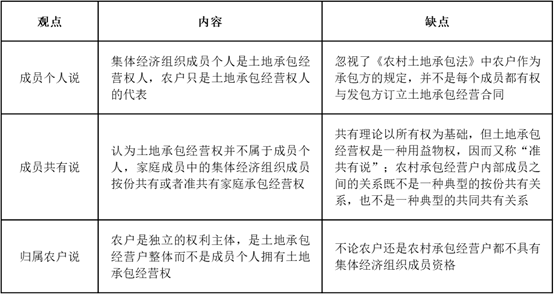 对于土地承包经营权的归属,理论界大致形成了三种观点。