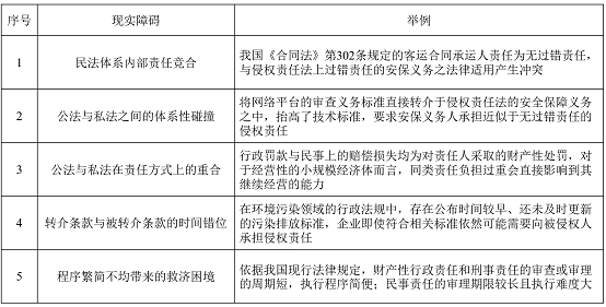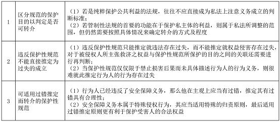 安全保障义务条款,是典型的公私法之间实现相互工具化的转介条款。我国的安全保障义务并未直接采纳德国法上宽口径纳入违反保护性法律的民事责任模式,而是搭建了一条较为轻巧的管道,以转介的方式直接对接公法上的安全保障义务,但在管道铺设的层面上还存在着如下障碍(见下表)。因此,从体系化的角度重新整合我国网络经营者的安全保障义务确有必要。