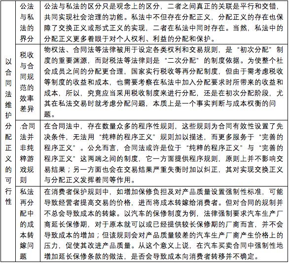 合同自由不是一种抽象宣示,而是一系列具体的制度,不仅包括欺诈、胁迫(涉及意思表示自由)、错误(涉及意思表示真实)等与缔约过程有关的规则,而且包括情事变更、合同解除、违约责任等与缔约结果有关的规则。合同自由在合同法内部受到实质公正乃至分配正义的制约,还受到包括侵权法、物权法中相关规则的限制,同时也受制于私法以外的管制规范。法律维护和促进分配正义是必要的。和税收等其他公法规范一样,合同法也可以被用以维护和促进分配正义。相比税收、社会保障制度或其他分配方式,以私法进行分配的效率并不更低,对个人自由的干涉也并不更高。而分配正义的思想则渗透于民法的各个分支。除了合同法外,物权法乃至侵权法都彰显分配正义的考量。