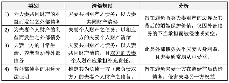 婚姻保护不仅是夫妻财产法的主导思想,亦决定夫妻内部债务之主要构造。外部债务的内部承担主要涉及如下规则: