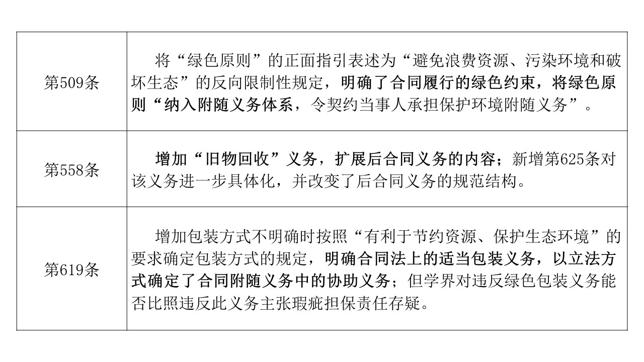 《民法典》合同编在原《合同法》的基础上新增加了4个与生态环境保护有关的条款,为合同领域植入了绿色要素,对经济交易活动提出了绿色要求,对生态文明的时代需求做出了回应。
