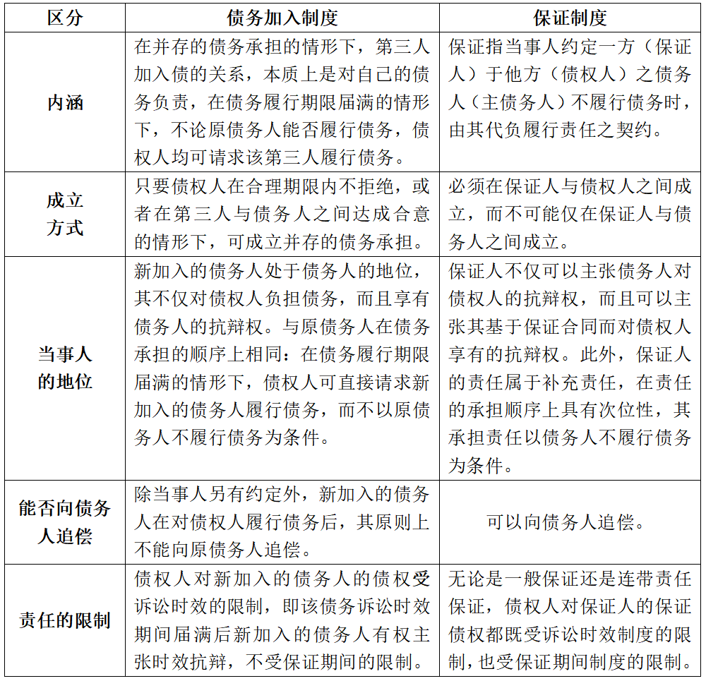 我国《民法典》第552条新增了债务加入制度,该项制度与保证制度在功能、成立方式以及法律效果上具有相似性。实践中在并存的债务承担中也可能存在保证担保,我国《民法典》第697条第2款也得以体现。然而,在第三人加入债的关系后,无论其是向债权人还是向债务人表示其愿意承担债务,都需要确定该第三人究竟是加入债务,还是提供保证,对此,我国《民法典》没有作出规定,理论界与实务界也有不同的看法,有必要从以下方面对两者进行区分。