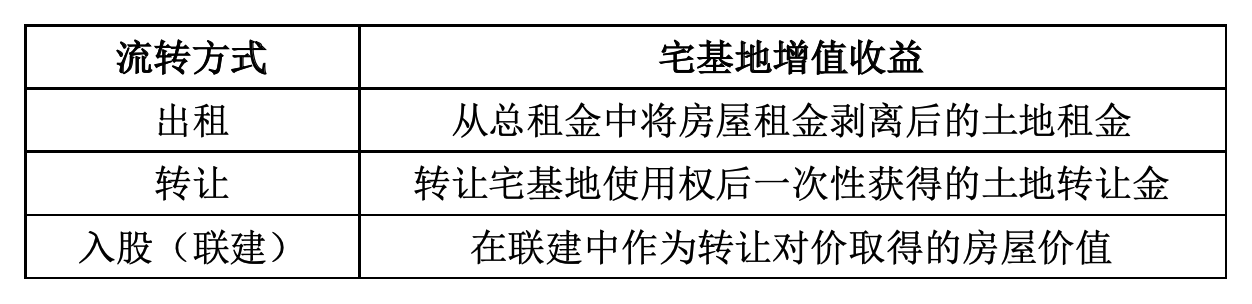 2.农户流转宅基地使用权形成的土地收益。现行法规框架下,宅基地使用权仅能在本集体经济组织成员内部进行流转,其只体现了占有和使用的权能。“三权分置”政策在一定程度上允许社会主体参与流转,扩大了宅基地使用权的流转范围和用途,体现了宅基地的交换价值,并带来了增值收益。具体而言: