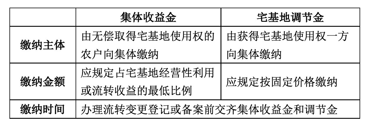 首先,集体收益金是集体获得的其宅基地所有权下收益权能的对价,无偿取得宅基地的使用权人在对宅基地进行经营性利用或流转时,亦应通过向集体补缴宅基地收益金以获取完整的用益物权;其次,集体收益金与有偿使用费不同。前者是集体对收益权能的行使,属于宅基地有偿使用,后者是集体对收益权能的处分,属于有偿取得;再次,集体调节金是集体基于宅基地管理权能获得的收益;最后,宅基地收益金与调节金的权利基础不同,不能混同也不能替代。