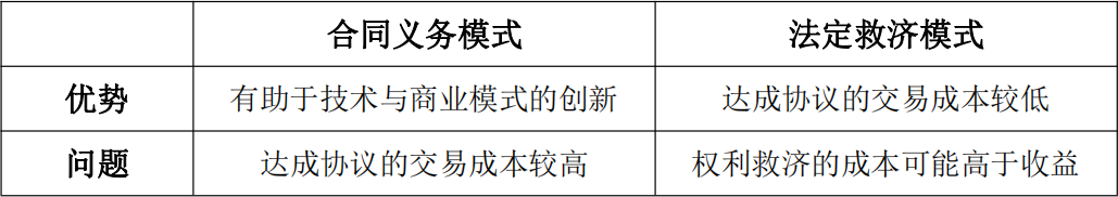 合同义务模式下,理论上可以达成有效率的资源分配。优势在于有助于技术与商业模式的创新,问题在于双方达成协议的交易成本较高;法定救济模式下,优势在于双方达成协议的交易成本较低,问题在于可能导致权利救济的成本高于收益。