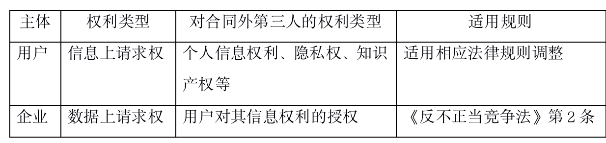 对企业数据权利与用户数据权利的讨论应包含个人信息、商业秘密、隐私权、知识产权的广义数据权利配置问题。用户信息权利属于用户的基础权利在信息层面的请求权集合。对用户而言,主要关注信息内涵的基础权利;对企业而言,其对数据所代表的基础权利并无任何权利,而是通过用户基础权利数据化获得生产力。数据权利与信息基础权利应当属于同一不可分割客体的两种价值层面,不能等同。