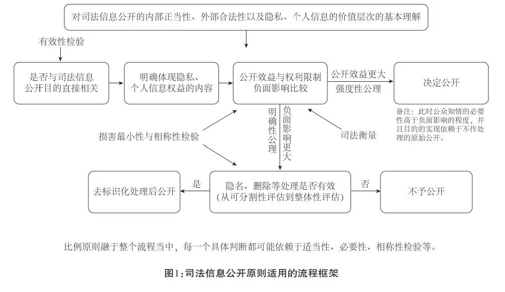 第一,适当性检验。从内部正当性层面来说,司法信息公开应以保障公众知情权下司法公正的实现为目的。从外部合法性层面来说,除专门规范外,司法机关还应当遵守《民法典》《个人信息保护法》中隐私权和个人信息保护的相关规则。