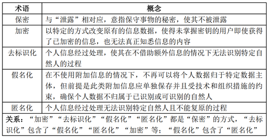 若要调和区块链信息透明与个人信息保密规范的冲突,则需对上链的个人信息采取特定的加密、去标识化等措施。为了明确法定保密义务的适当履行方式,需要分析加密、去标识化、假名化、匿名化等概念。