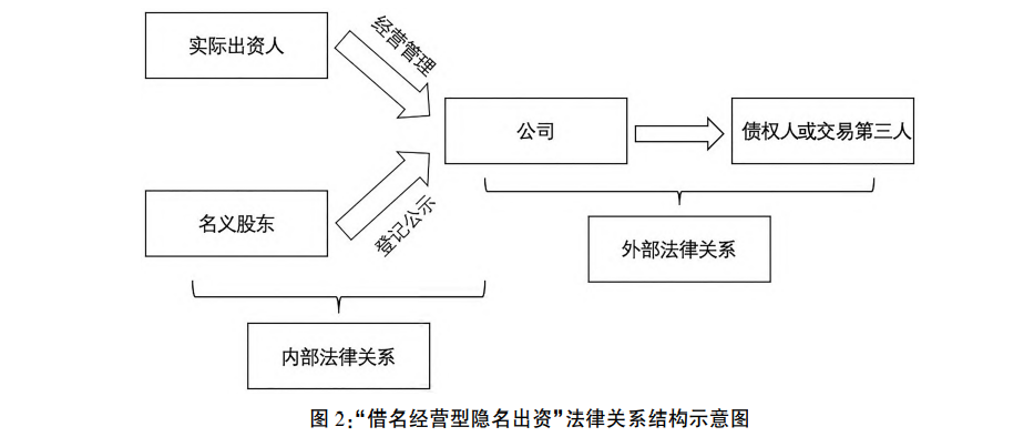 其次,在“借名经营型隐名出资”中,出资义务的履行人与股东权利的实际行使人均系同一人,而将本来“置身事外”的身份关系转化为其与公司之间的直接联系。该类型的法律关系图如图所示: