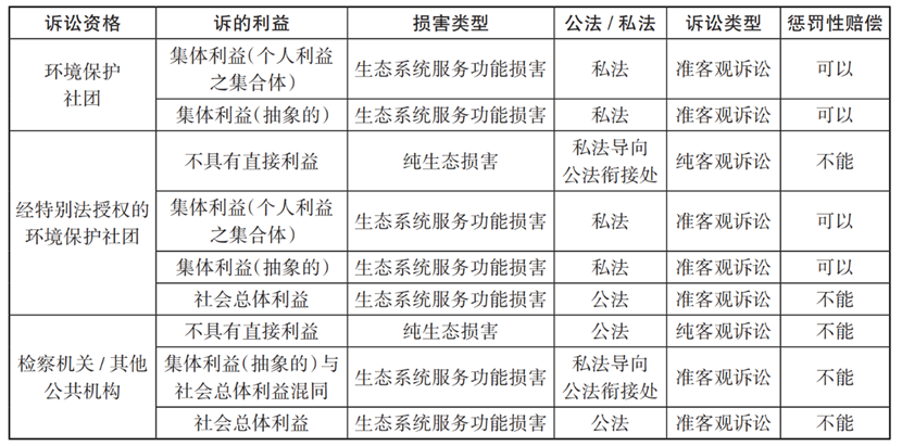 我国的生态环境损害赔偿范围基本覆盖了法国法所规定的这两大部分,依据诉讼利益类型和诉讼类型的划分,可以包括以下部分。第一,“纯生态损害”,对其的诉讼主张属于公益性的纯客观诉讼类型,发生了集体利益与社会总体利益的混同,因此属于私法与公法汇流的衔接处,不能适用于惩罚性赔偿。第二,基于“主观的、集体的损害”,如生态服务功能的损害,这种集体损害既包括具体的也包括抽象的。集体损害不是一般公共利益的损害,而被认为就是“集体”这种新型法律实体传统意义上的“本人的利益”,因此原则上可以适用惩罚性赔偿,个人和检察机关可以行使诉权,且并不要求具有“某种主观权利”,而仅仅要求“有某种利益受到侵害”的诉讼。由此,我国未来生态环境损害的构成,及其适用惩罚性赔偿的可能性如下(见表1)。