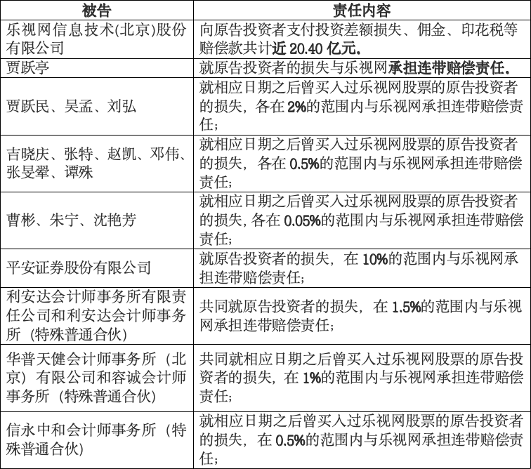 2023年9月22日,乐视网虚假陈述案一审判决出炉,北京金融法院长达238页、13万余字的判决书,根据各被告的不同情况有针对性地确定了乐视网、贾跃亭等被告因虚假陈述行为应对2495名投资者承担的民事责任(详见下表)。