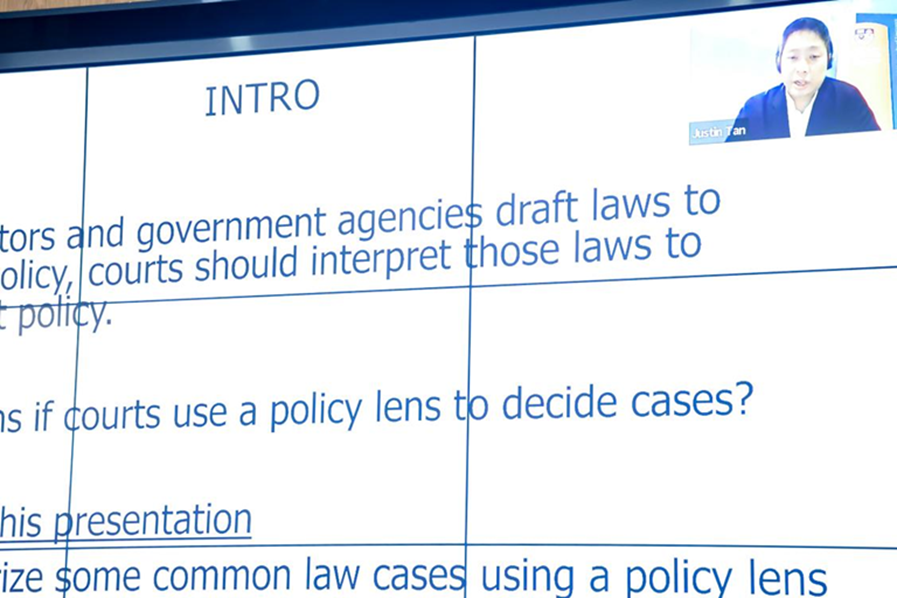 新加坡国立大学法学院副院长Justin Tan围绕“从政策角度解释法规——普通法经验”进行了发言。Justin Tan以普通法地区的相关案例,如英国针对佃户的税收优惠、“家庭成员”概念的变化、政府和保险公司关于医疗保险合同细则的谈判等为例,展示了每个法案背后的政府意图,进而说明政府是如何通过法规进一步推动政策的实行。
