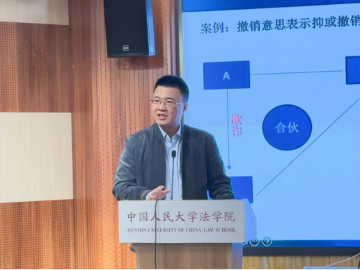 2024年10月20日上午,第538期民商法前沿论坛在中国人民大学明德法学楼602教室线下成功举行。华东政法大学法律学院教授杨代雄以“意思表示与法律行为的关系”为主题发表报告,北京大学法学院长聘副教授纪海龙、北京航空航天大学法学院副教授王琦、中国政法大学民商经济法学院谢远扬老师围绕该主题发表与谈意见,中国人民大学法学院教授朱虎、中央财经大学法学院副教授徐建刚出席论坛并参与讨论,中国人民大学法学院博士生章豪主持论坛。