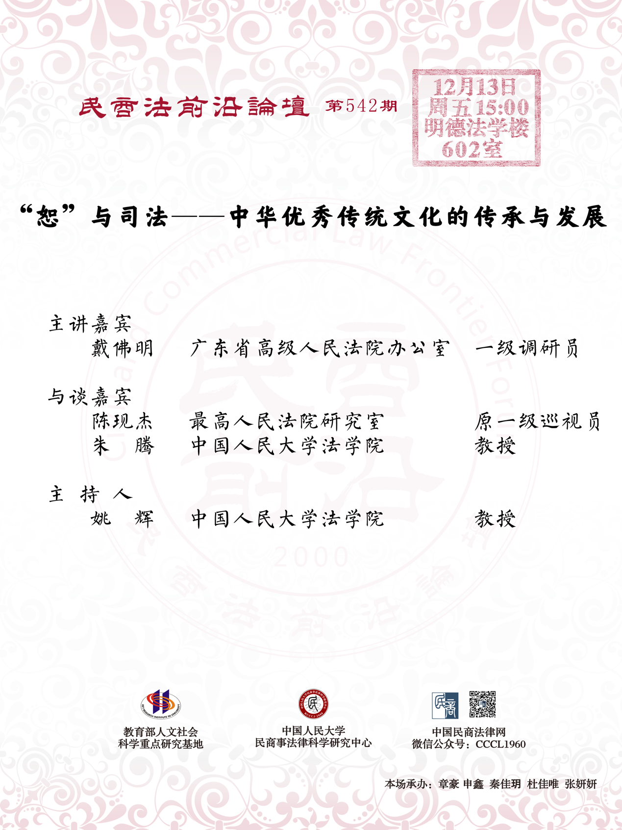 诚如习近平总书记所指出,“中华法系源远流长,中华优秀传统法律文化蕴含丰富法治思想和深邃政治智慧”。本次讲座将围绕“恕”与司法的全方位融通,深刻解读中华优秀传统法律文化如何实现创造性转化、创新性发展。