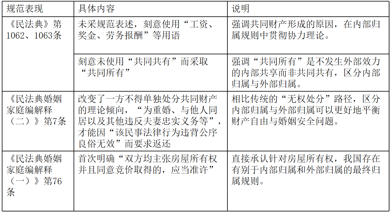 区分内部归属、外部归属、最终归属的夫妻共同财产三重归属规则,可同时实现公平、安全、效率三大价值,具有明显的优越性。其中,内部归属确定夫妻内部财产份额划分、外部归属决定交易中共同财产的权利归属、最终归属解决离婚后共同财产的分割问题。