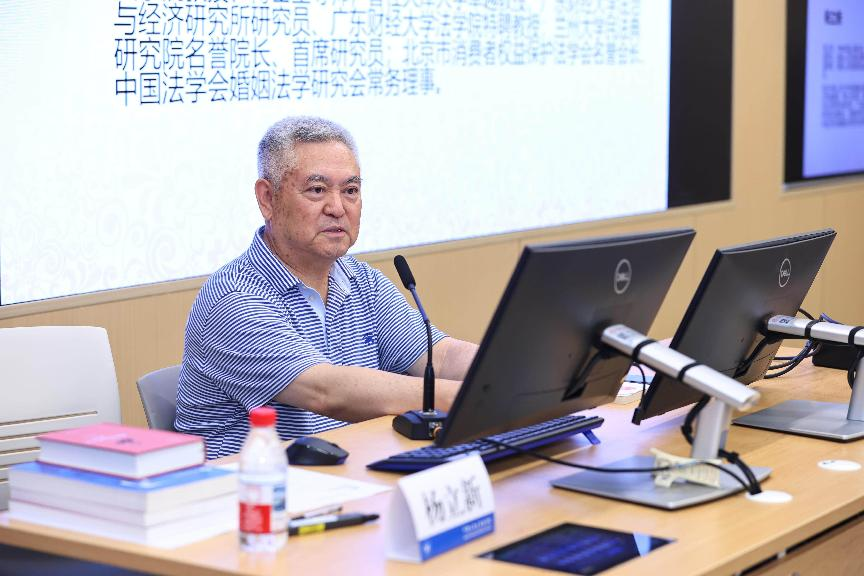 首先,主讲人杨立新教授围绕民法典婚姻家庭编司法解释进行了主题报告。杨教授以历史分析方法从中国民法与婚姻法“形式分离——理论合并——体系融合”的发展历史引入,分析了学界对婚姻家庭法在回归私法体系后的广泛重视,及其在《民法典》编纂过程中体系位置的探索。重点展开讲述了婚姻家庭编在司法领域和价值追求中的一般性与特殊性,揭示婚姻家庭“身份、财产共同体”的灵魂所在,以及身份法律行为突出的要式性特点。