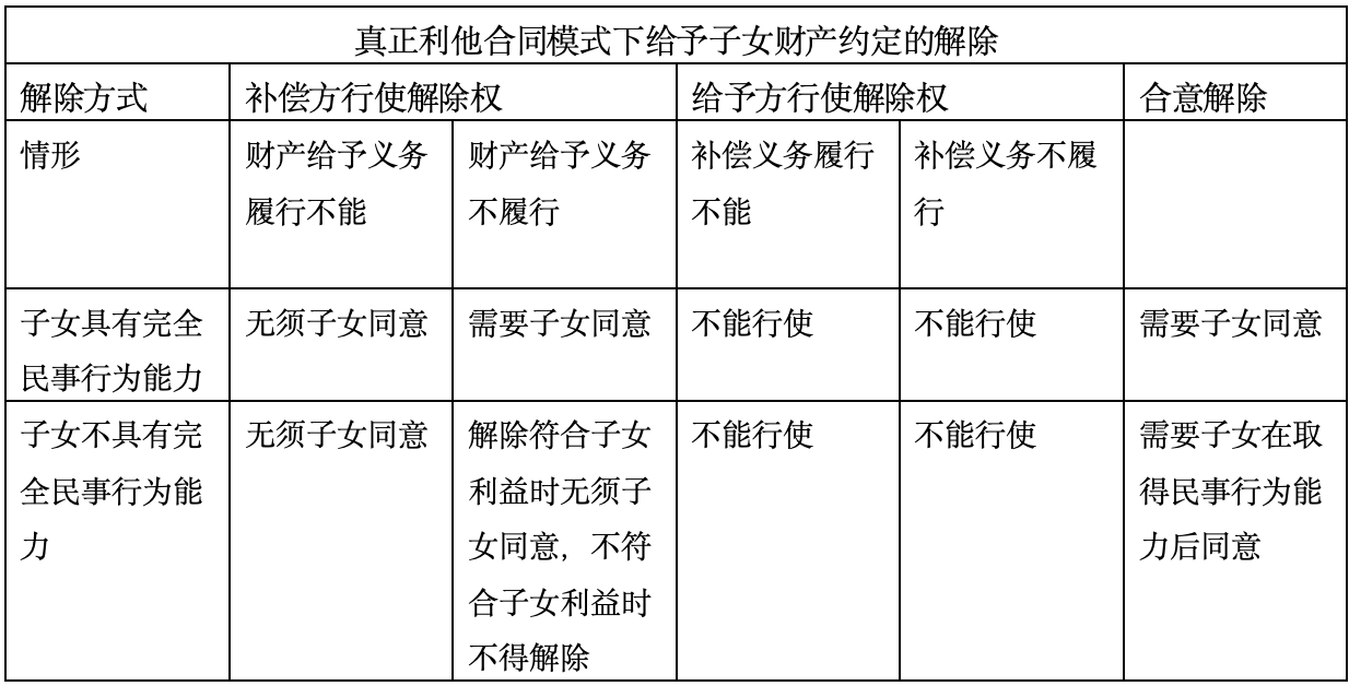 反之,若约定仅构成不真正利他合同,则父母双方可依据《民法典婚姻家庭编解释(二)》自行合意解除,无须子女同意。但是,补偿方需另行行使任意撤销权,消灭作为对价关系的赠与合同。
